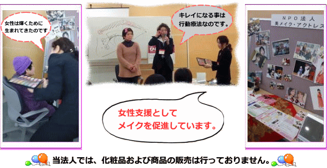セミナー・講演 随時ご相談くださいませ。 その他、メイク関連におけるイベントもお受けいたしております。 NPO法人 美メイク・アクトレス 〒671-0224 兵庫県姫路市別所町佐土1-100 ボヌールエトワール1番館302 【TEL】TEL 079-251-2301 / 090-3186-6432 【MAIL】 info@bimake-actress.info |
