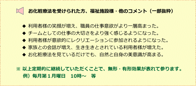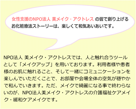 【対 象】福祉介護施設・養護施設 病院 【料 金】1回20,000円~63,000円(2時間~1日イベント等賜ります。) 人数・内容・他メニューとの関連、アシスタント人数等、ご希望に対応致します。 【施術者】NPO法人 美メイク・アクトレスにて、ボランティアメイク講座研修者および、 介護福祉士資格保有者、美容師免許所有者、元美容店員、エステシャン 【お申込み・お問い合わせ先】 info@bimake-actress.info または 090-3186-6432まで